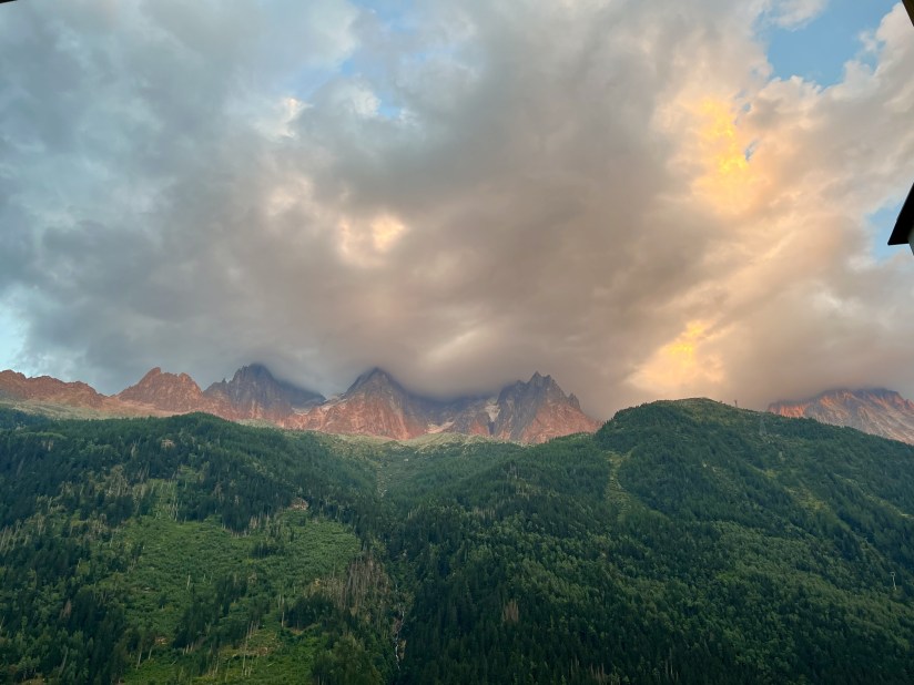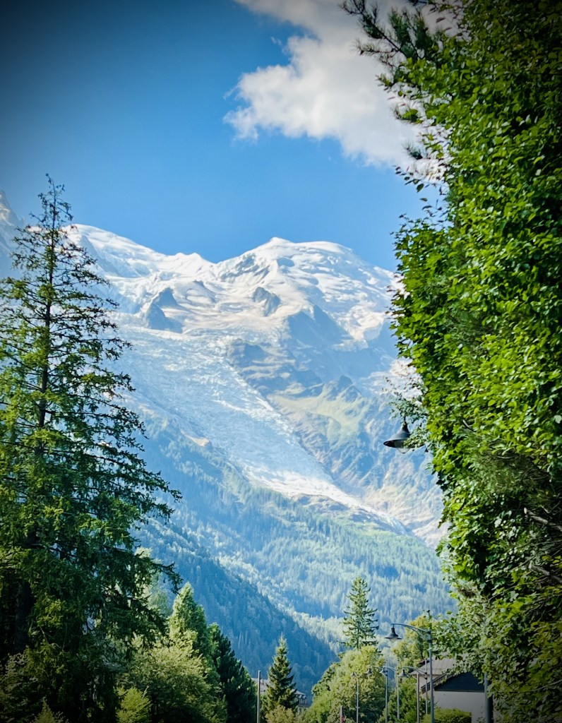 (Le glacier des Bossons, à 1420 mètres d’altitude, nous accueille chaque année à notre arrivée à Chamonix. C’est la première chose que nous voyons. Malheureusement, chaque année nous constatons les ravages du réchauffement climatique qui le réduit inexorablement…)