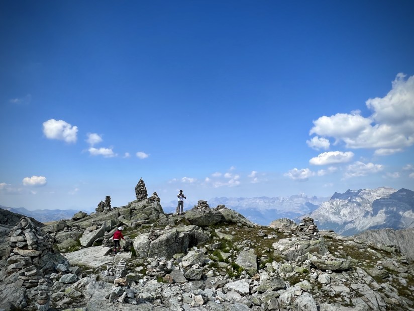 (Ces petits tas de pierres sont constitués par les randonneurs sur les chemins de randonnées, ici au Brévent (2425 mètres). Chacun y dépose une ou plusieurs pierres en passant. Ces Cairns servaient au départ à baliser un terrain souvent difficile à entretenir ou à matérialiser un pic afin de guider les randonneurs de montagne. Aujourd’hui, il semblerait qu’ils aient pour signification « je repasserai par là, je reviendrai ». Dans certains parcs naturels protégés, ils sont vivement déconseillés voire interdits car ils endommagent le terrain et représentent une menace pour la biodiversité du lieu).