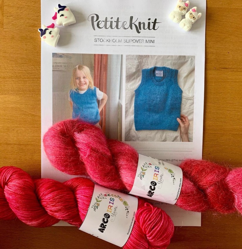 Pour ce pull sans-manches que Nina adore et qu’elle ne quitte pas, j’ai utilisé 2 fils : un fil fingering Mérinos SW coloris Croquet et un fil lace Kid Mohair et Soie assorti, tous deux teints à la main par Ludivine de https://arcoirisyarns.com